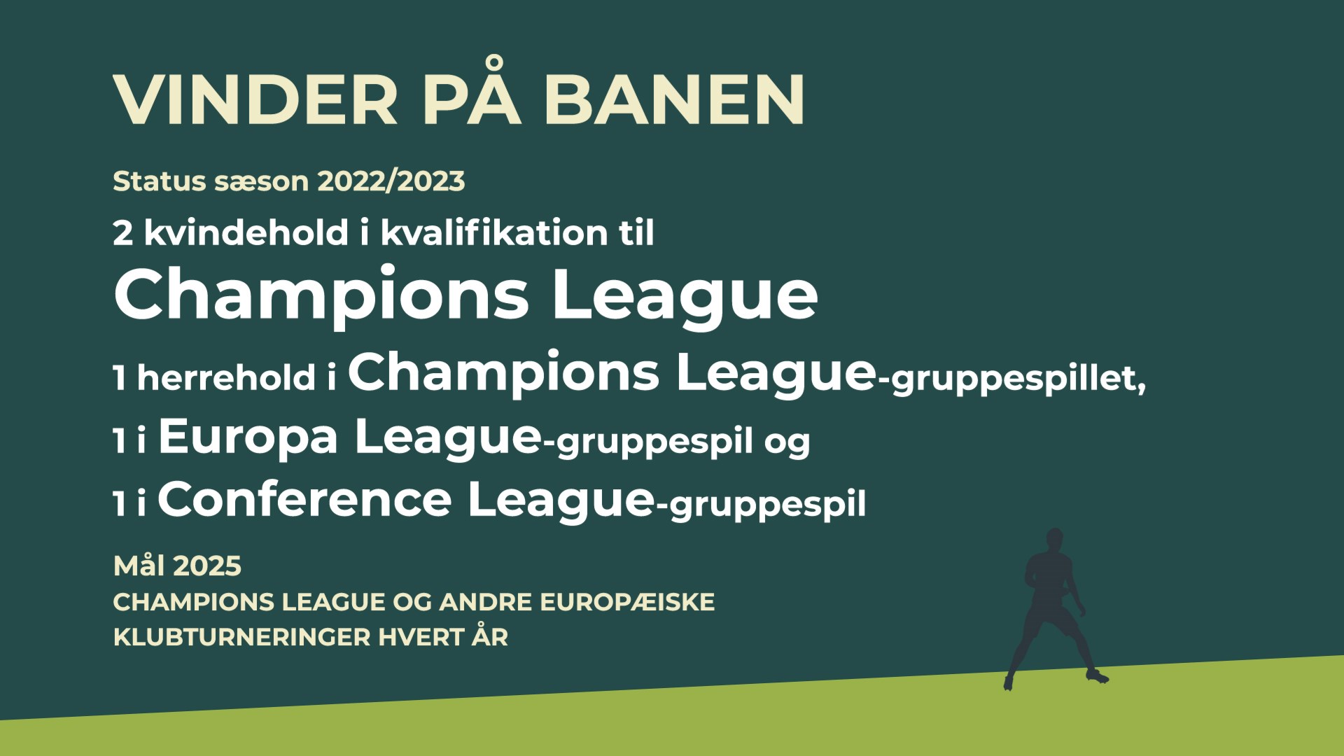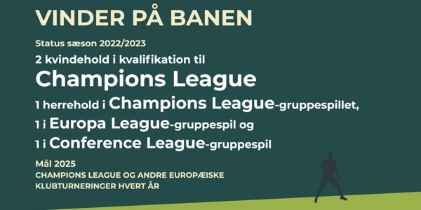 Vi har sat ambitiøse mål for den professionelle danske fodbold for mænd og kvinder: Vi vil være med i toppen, stræbe efter at vinde EM eller VM og være med i Champions League og andre europæiske klubturneringer.