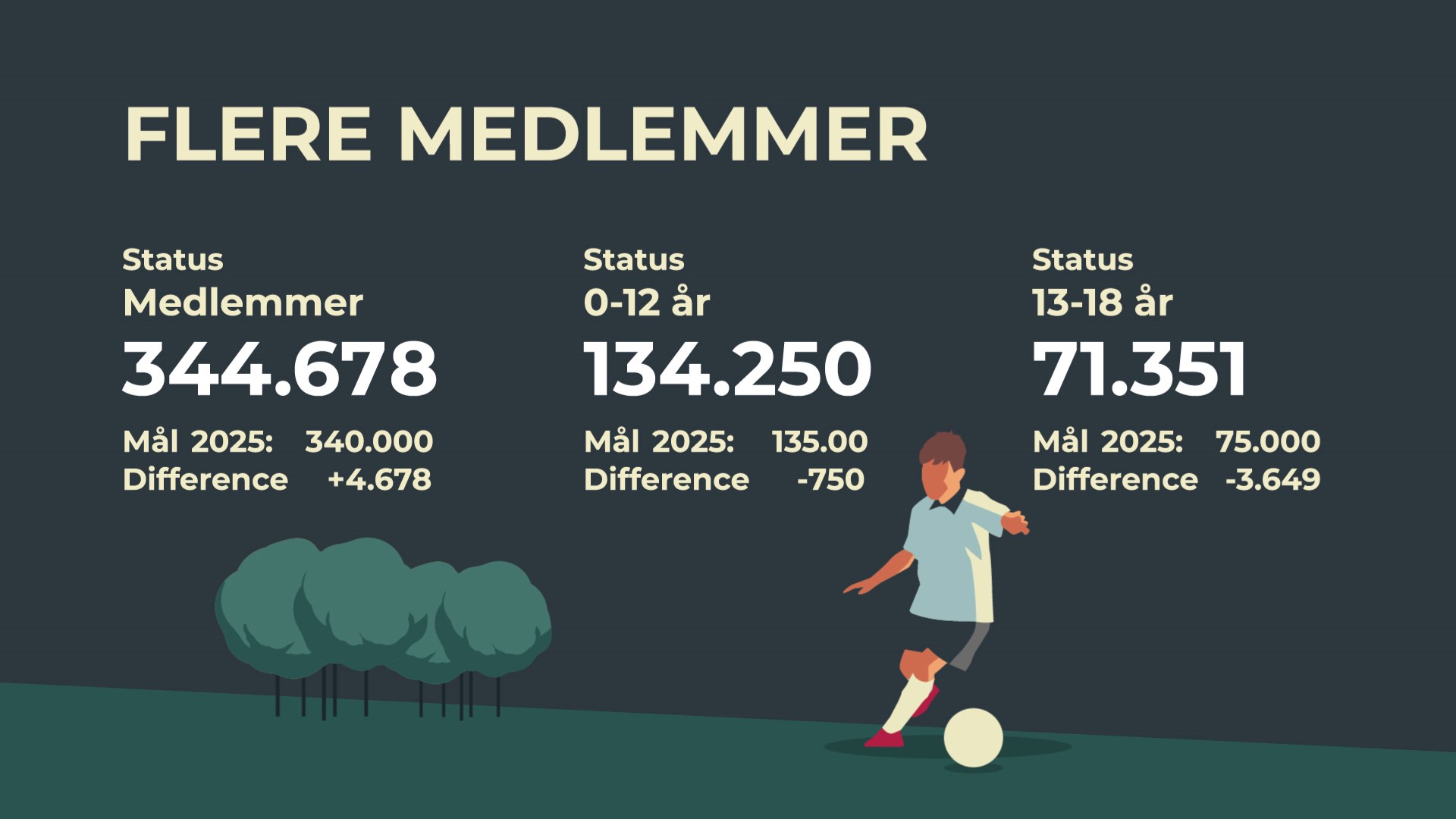 Vi har sat os nogle mål for antallet af medlemmer i fodboldklubberne. Den gode nyhed er, at vi har overgået vores mål; 340.000 medlemmer. Nu gælder det om at holde fast og fortsætte med at give både børn, unge og voksne nogle gode oplevelser, så de fortsætter med at spille fodbold.