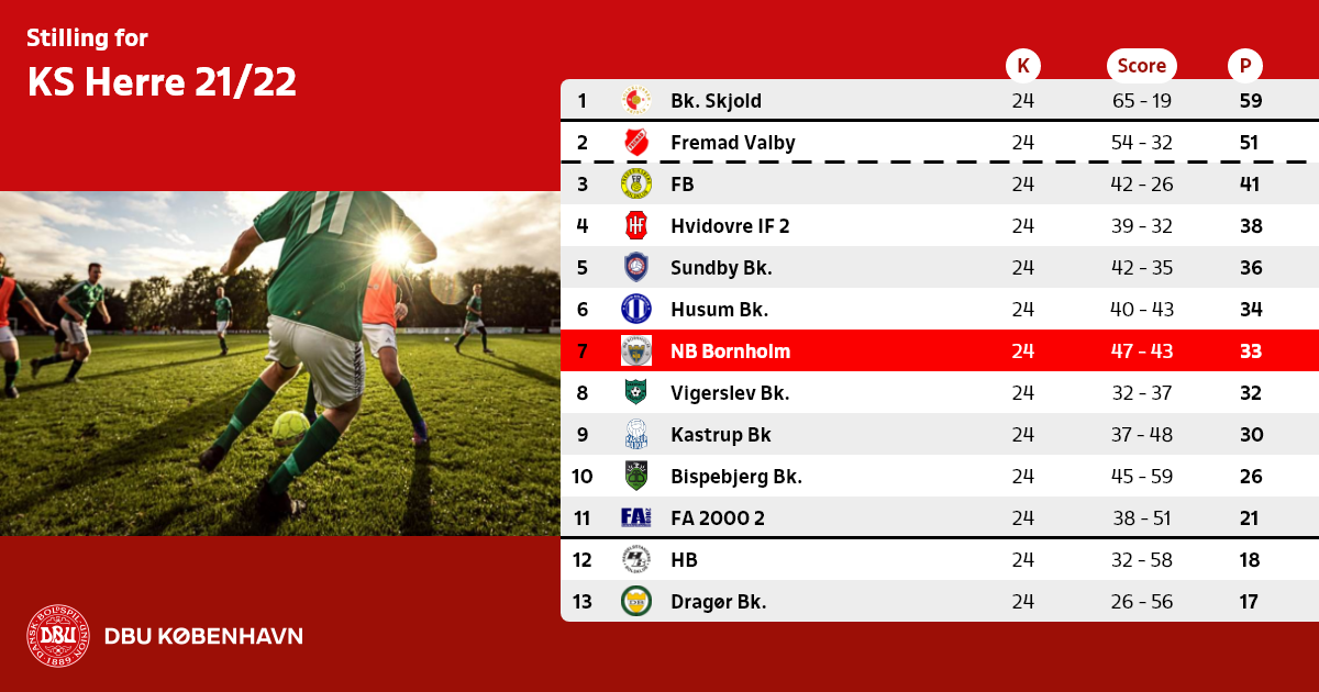 2. hold fra DBU København-klubber rykker ned i Serie 1 pulje 2, mens NB Bornholm vil rykke ned i DBU Bornholms bedste række.